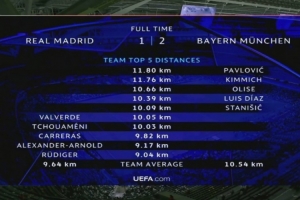 拜仁2-1皇马跑动数据:帕夫洛维奇11.80km最多,前五均是拜仁球员