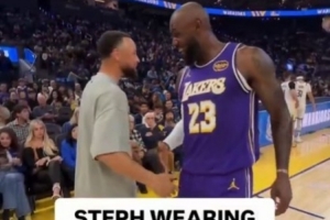 詹姆斯和库里赛前开心寒暄 镜头给到库里穿的詹姆斯10代签名鞋