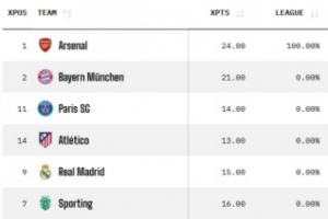 欧冠夺冠概率:阿森纳34%居首,拜仁巴黎马竞分列2-4,皇马仅3%