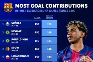 巴萨生涯前150场参与进球榜:苏牙189球居首 亚马尔100球第十