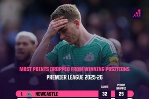 本赛季英超领先情况下丢分榜:纽卡25分最多 切尔西19分 曼联16分