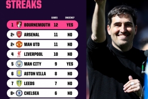 本赛季英超连续不败场次榜:伯恩茅斯12场居首,阿森纳、曼联11场