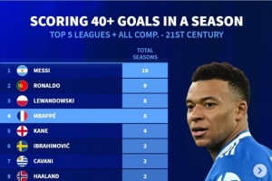 体育资讯4月24日讯 德国转会市场列出了本世纪五大联赛球员进球40+的赛季数量,梅西、C罗、莱万前三,姆巴佩5个赛季进球40+排名第四位。