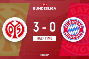 伤停补时3分钟。半场结束,拜仁慕尼黑0-3美因茨。