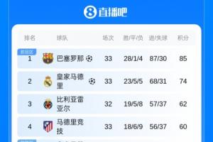 西甲积分榜:巴萨11分优势领跑!马竞取近5轮首胜领先贝蒂斯10分