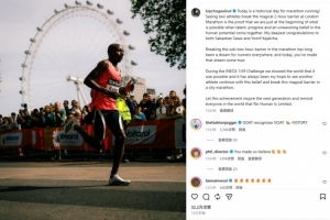 马拉松传奇选手基普乔格在社媒发文,向完成全马破2壮举的萨维和科杰尔查送上了祝贺。