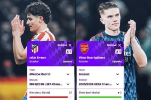 阿尔瓦雷斯(马竞):射门(不计被封堵)2.7次,射正1.7次,进0.8球,转化率23.08%,助攻0.4次,创造机会2.7次,成功过人1.9次,造犯规0.5次,对方禁区内触球5次
