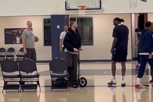 此前跟腱受伤的迪文岑佐今天也来到训练馆看望队友,给队友加油鼓劲。