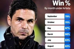 阿尔特塔执教阿森纳各个月份胜率(胜率从高到低排序):